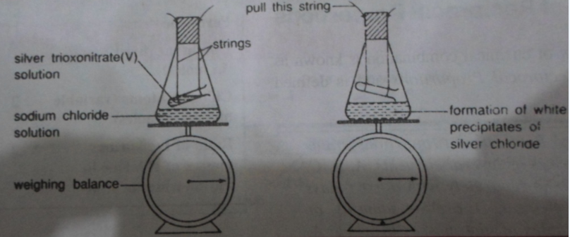 Result: When the two reactants are mixed together, a white precipitate is formed indicating that a chemical reaction has taken place. The new substances formed are known as the products of the chemical reaction. The masses of the system taken before and after the reaction are found to be the same, indicating that the mass of the reactants equals that of the products.