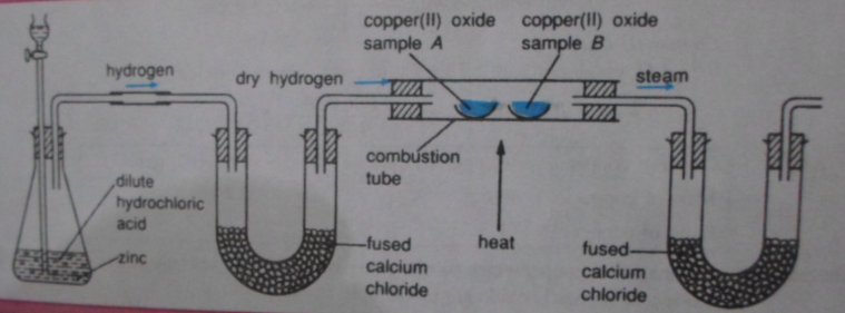3.Reweigh and determine the mass of each sample. Place the boats inside a hard glass tube as shown. Heat the samples stronglywhile passing a stream of dry hydrogen gas through the tube. After some time, a reddish- brown copper residue is left in each boat. Remove the flame, but continue passing the hydrogen as the copper residues cool down. This presents the re-oxidation of the hot copper residue by atmospheric oxygen. Any water formed during the reaction is absorbed by the fused calcium chloride in the adjacent U-tube.